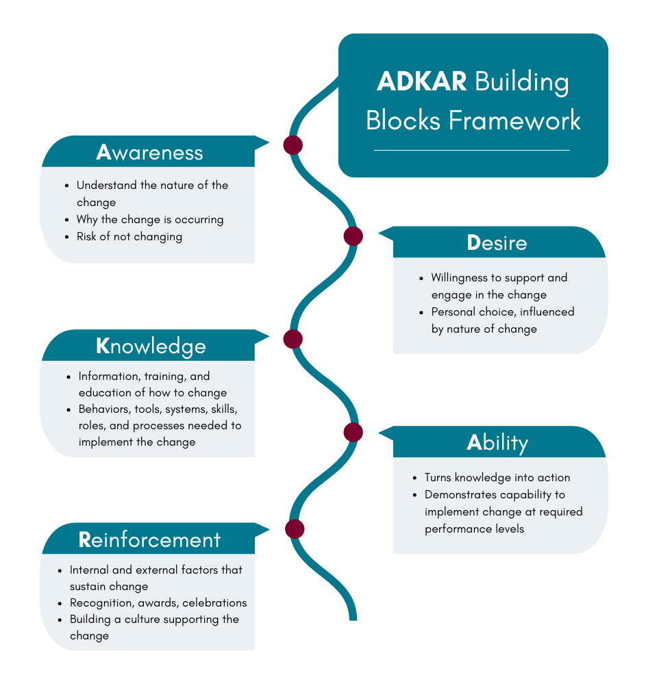 Our approach to OCM is based on Prosci’s ADKAR framework, decades of experience, and industry best practices learned through regular participation in learning from the OCM community, including the Association of Change Management Professionals. We customize every approach based on each organization and project, to address the specific stakeholders, risks, history of change and goals of the project. Experience shows us that change efforts with the highest likelihood of adoption and sustainability are: